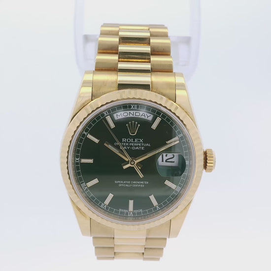 Rolex 118238 Day-Date 18k yellow gold green dial presidential watch