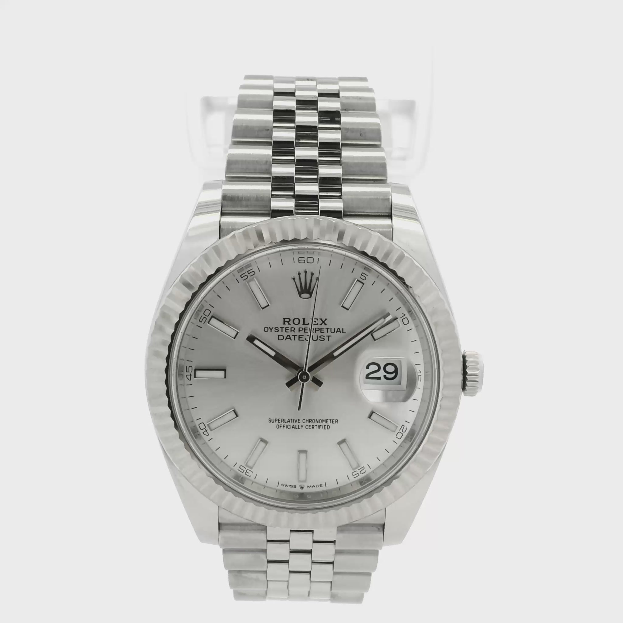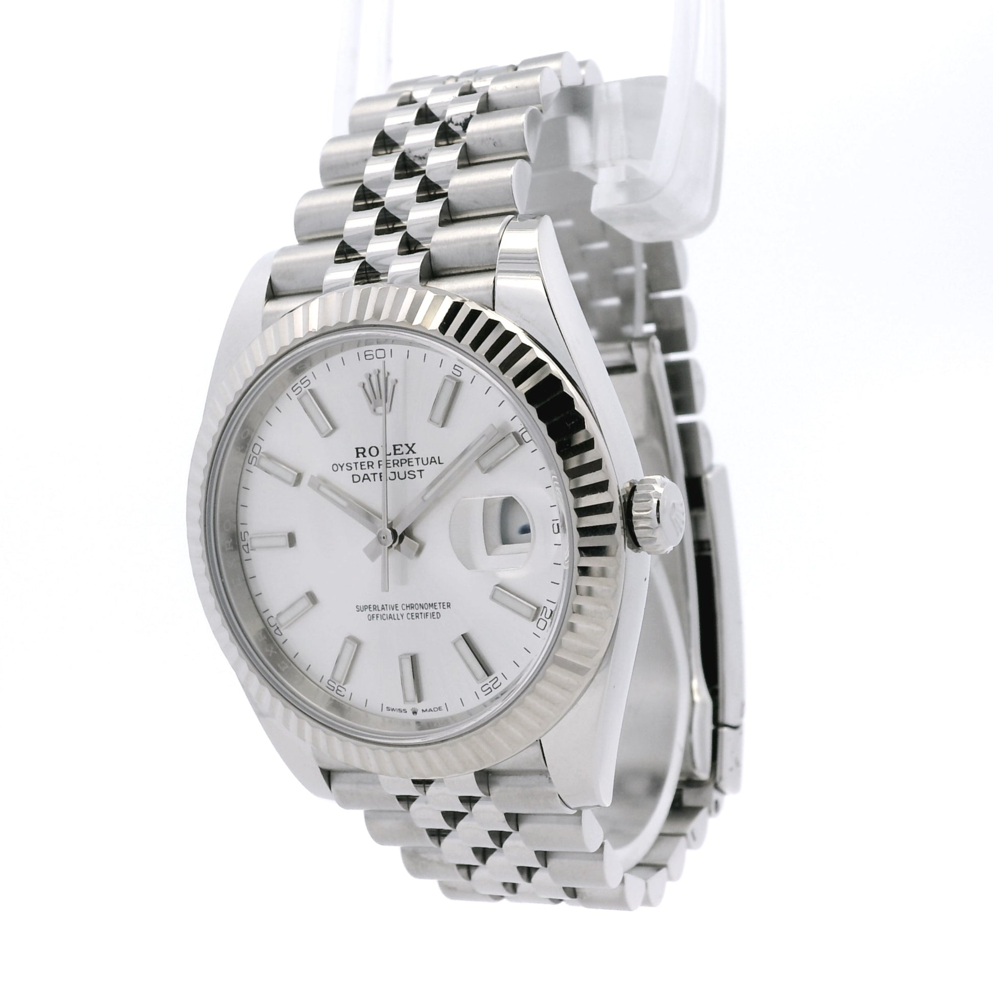 Rolex 126334 Datejust 18k White Gold Fluted Bezel Silver Dial on Stainless Steel Jubilee Bracelet Watch