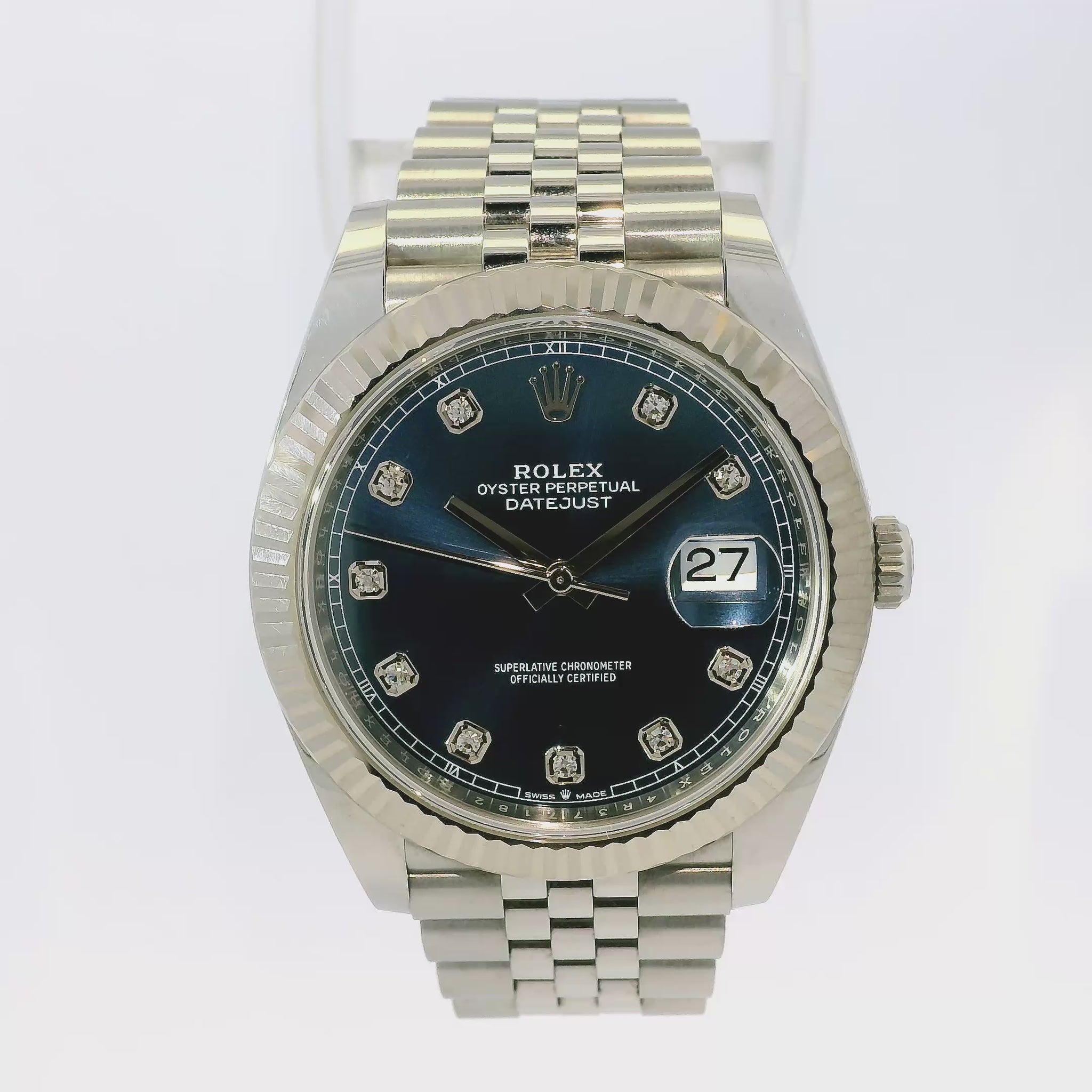 | Dial | Blue Dial with Silver Hands and Diamond Hour Markers. Date at 3 o’clock. |