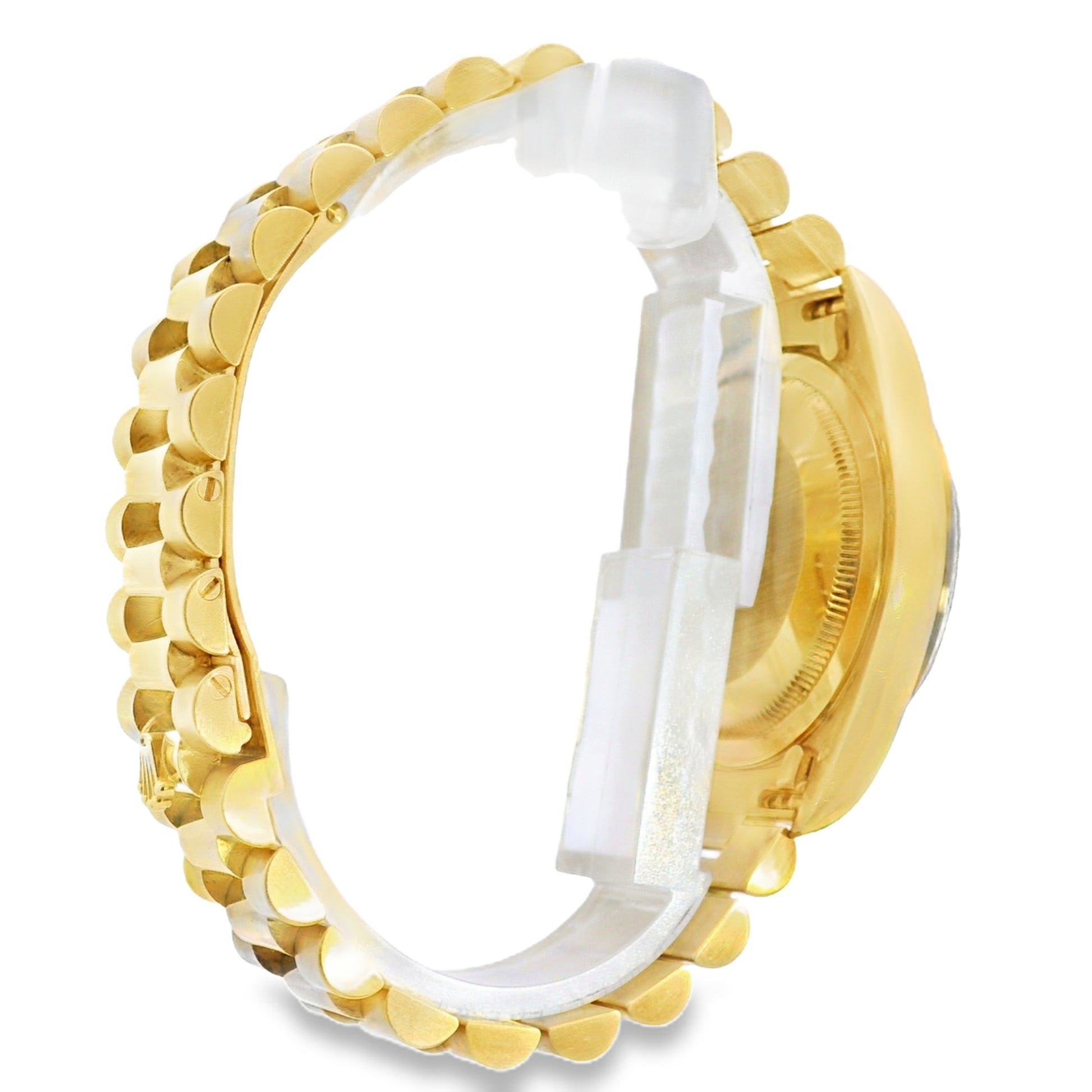 The champagne dial is complemented by gold luminous hands, offering excellent legibility while maintaining a refined, classic aesthetic. Protected by a sapphire crystal and powered by a Rolex automatic movement, this Day-Date delivers both durability and precision. The hidden folding clasp ensures a seamless, sophisticated look on the wrist.