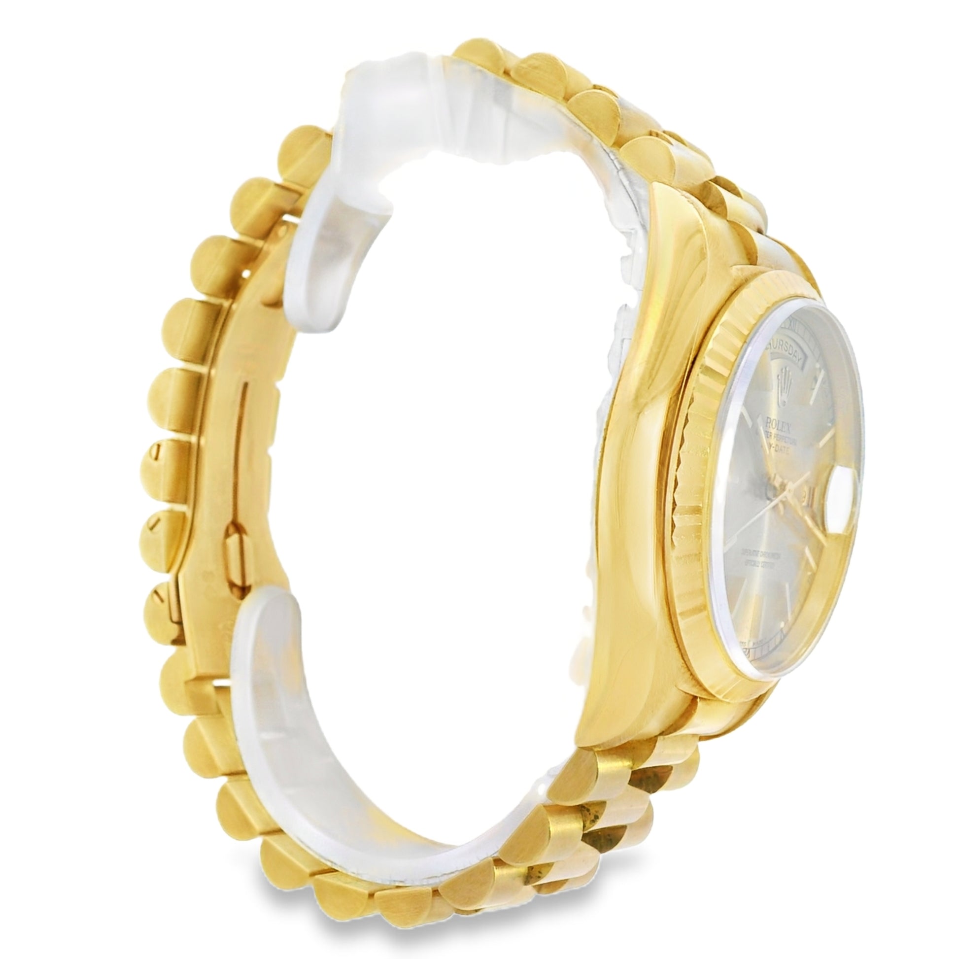 This Rolex Day-Date ref. 18238 is a timeless expression of prestige and craftsmanship. Crafted entirely from solid 18k yellow gold, this iconic 36mm timepiece features Rolex’s signature fluted bezel, a rich champagne dial, and the legendary Presidential bracelet for unparalleled elegance and comfort.