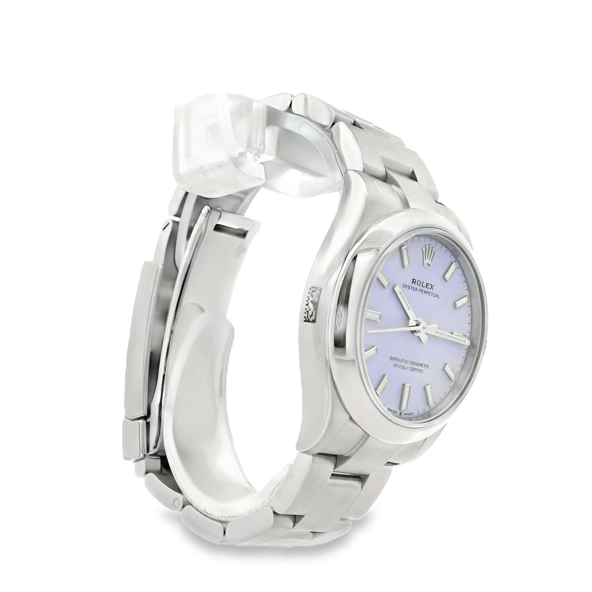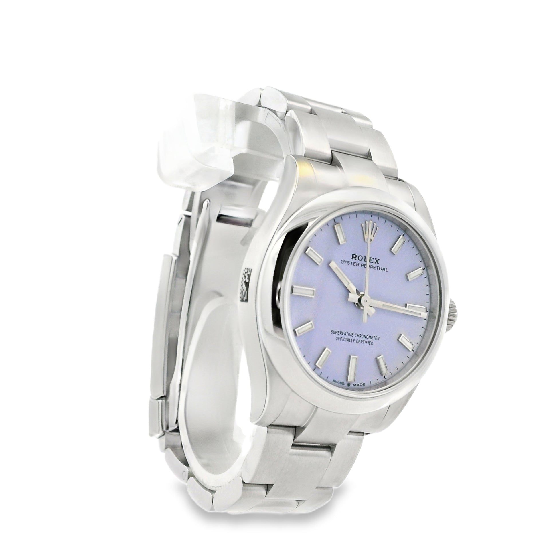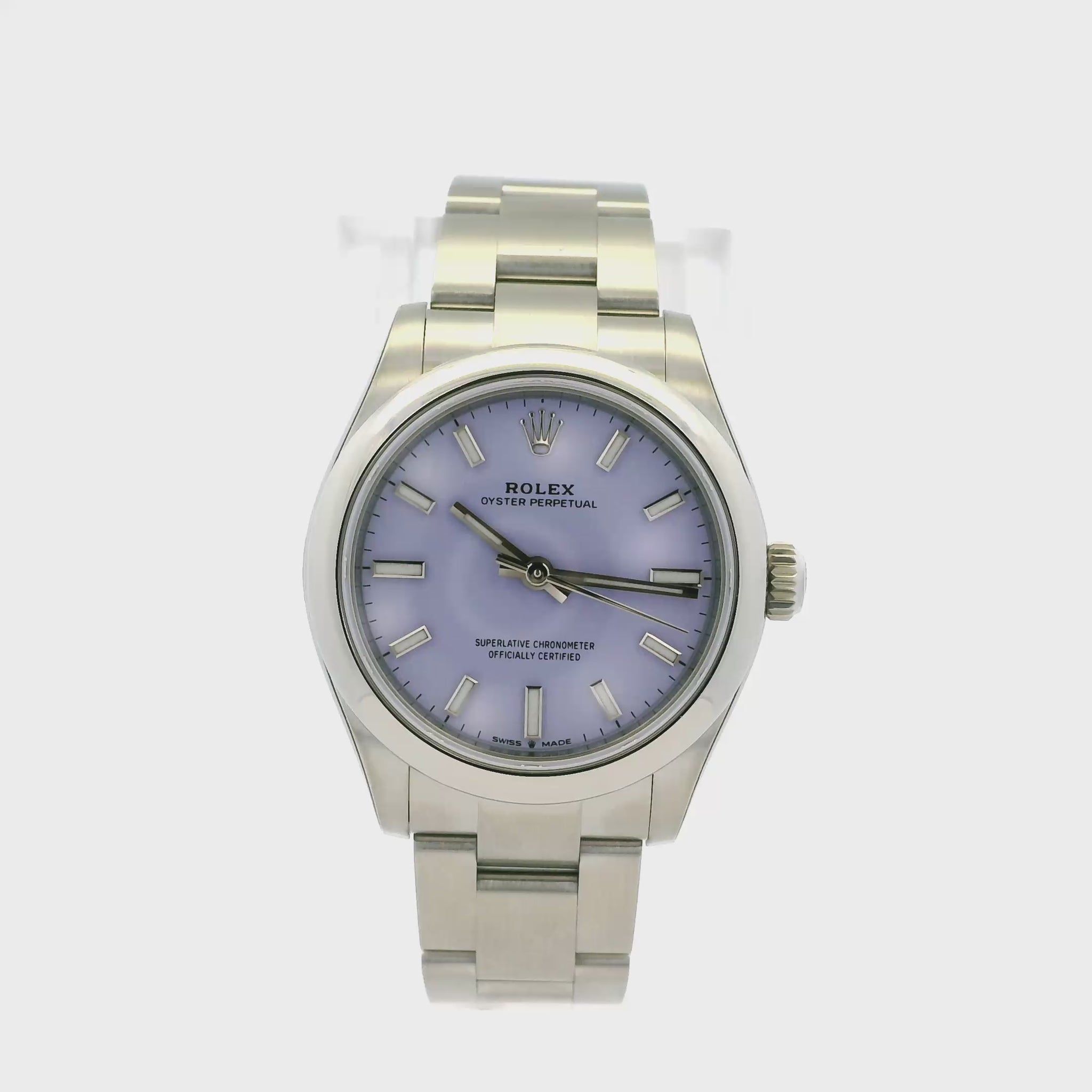 This stunning Rolex Oyster Perpetual 277200 is a modern classic, featuring the highly sought after lavender dial housed in a refined 31mm stainless steel case. Known for its timeless design and exceptional craftsmanship, this Oyster Perpetual offers effortless elegance with a contemporary edge. The smooth stainless steel bezel frames the vibrant lavender dial beautifully, creating a clean and sophisticated aesthetic suitable for everyday wear or special occasions.