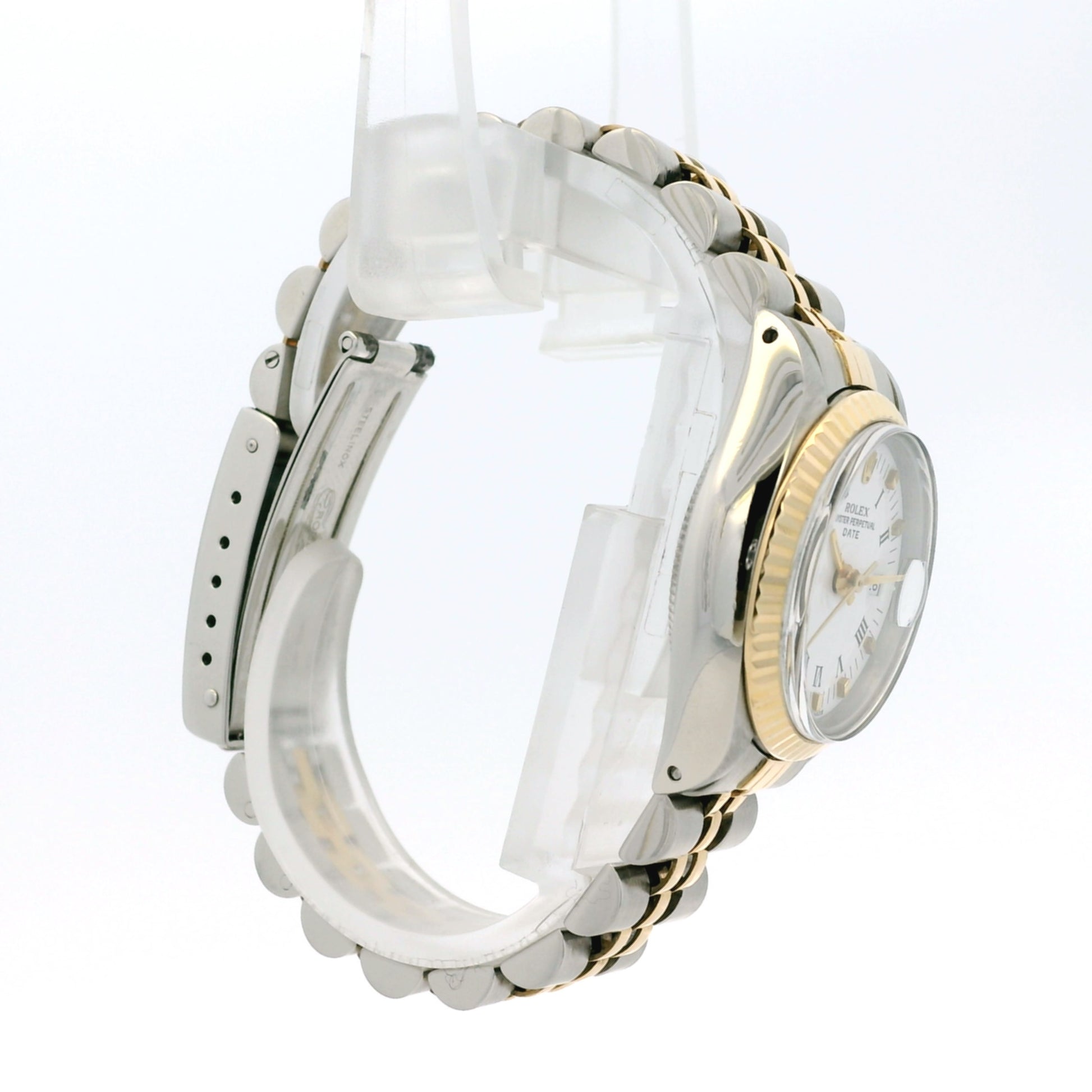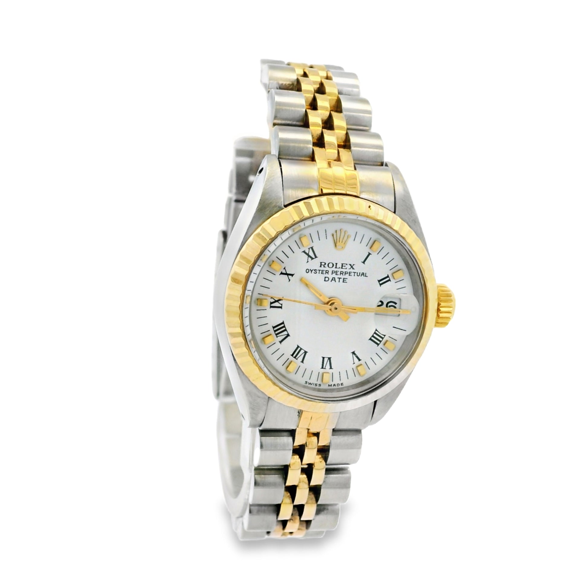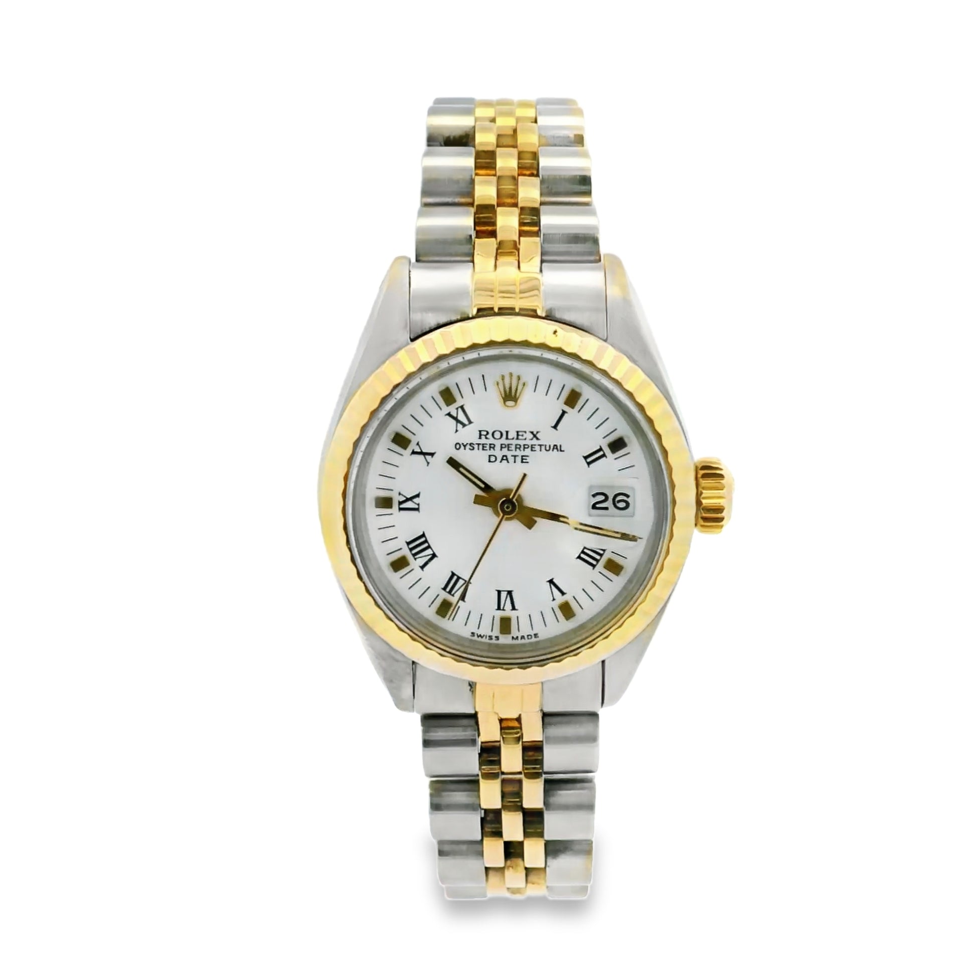 This classic Rolex Oyster Perpetual Datejust reference 6917 showcases timeless elegance in a refined stainless steel and 18k yellow gold design. Featuring a 26 mm case, this iconic timepiece is accented by an 18k yellow gold fluted bezel that adds unmistakable Rolex character and sophistication. The white dial is beautifully detailed with gold indices and black Roman numerals, offering a striking contrast and excellent legibility, with the signature date window positioned at 3 o clock.