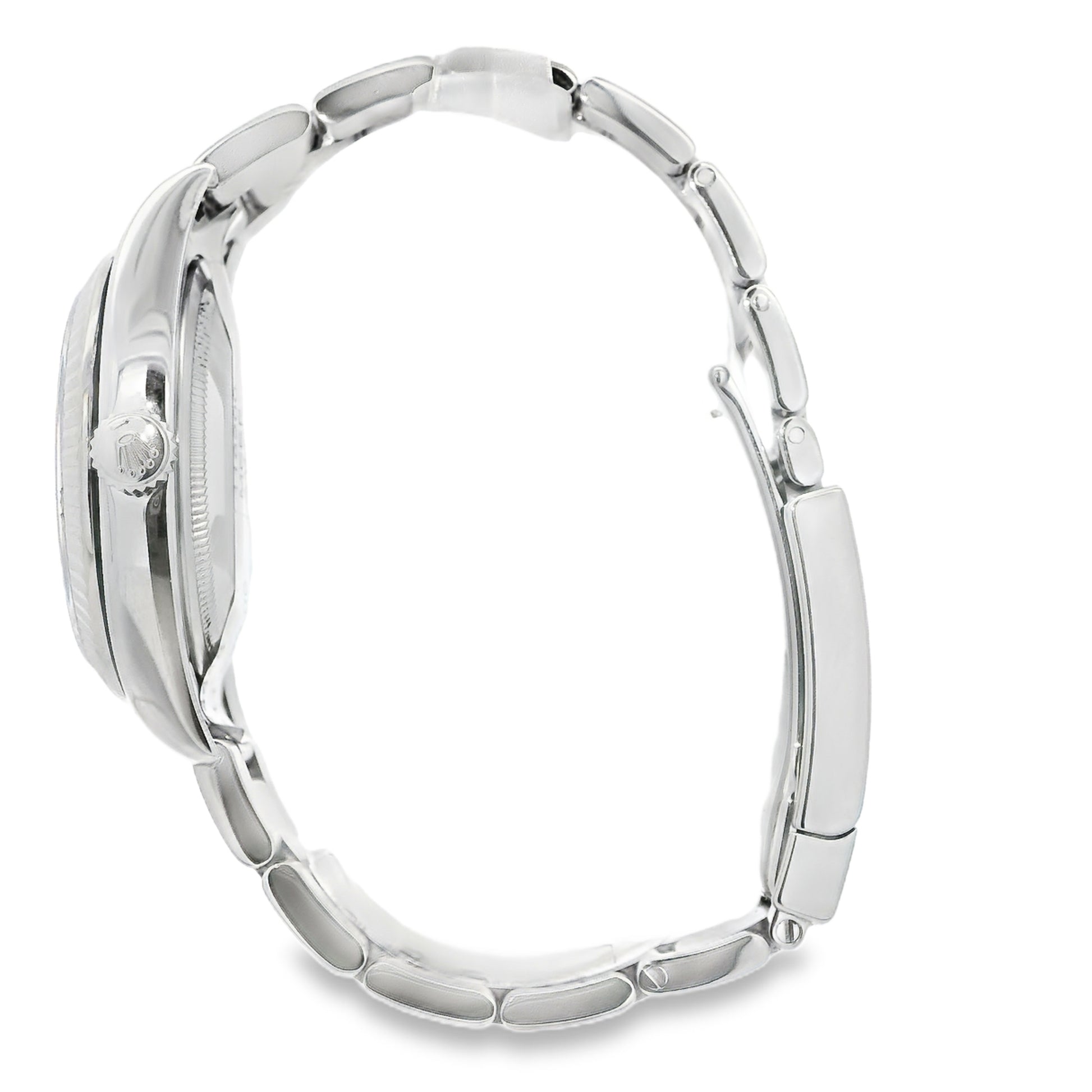 Crafted for both elegance and comfort, the stainless steel Oyster bracelet hugs the wrist with a graceful fit, secured by a fold-over clasp. Powered by a precision automatic movement, this Rolex delivers not just beauty—but dependable performance.