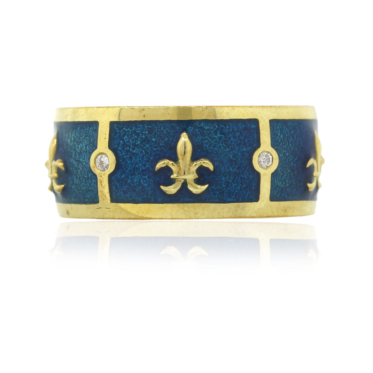 Tesoro 18k Yellow Gold Fleur De Lis Ocean Blue Enamel Band Ring