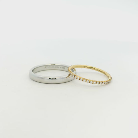 This elegant Tiffany & Co. wedding band set is a timeless expression of craftsmanship and refined design. Crafted in a striking combination of 18k yellow gold and platinum, the set offers a beautiful contrast that highlights Tiffany’s signature attention to detail.