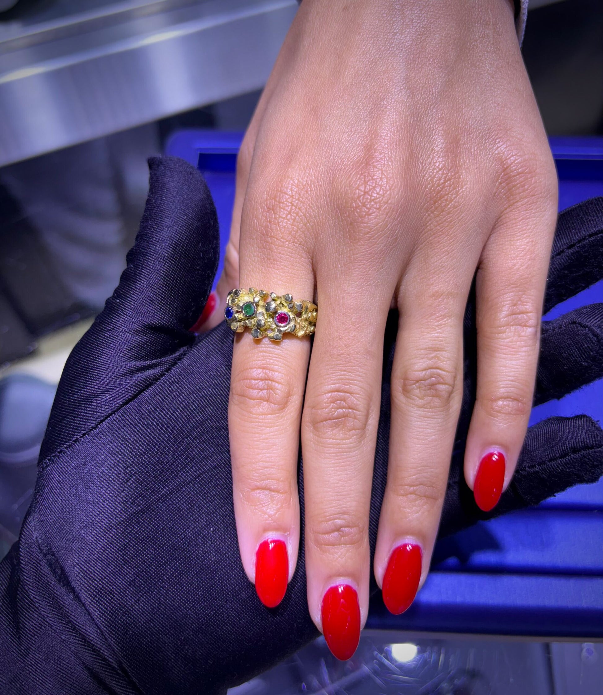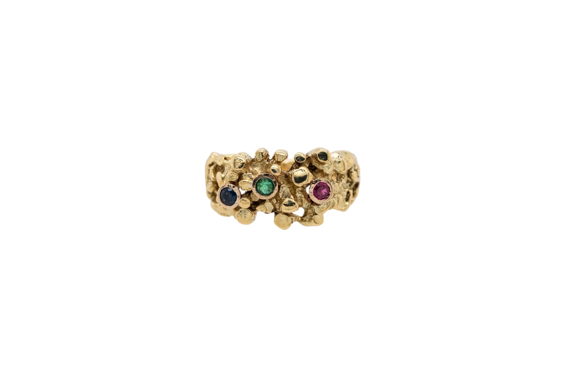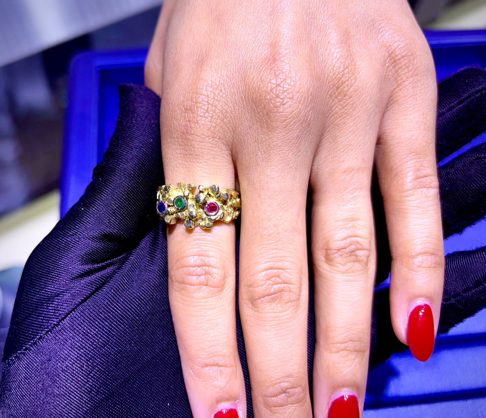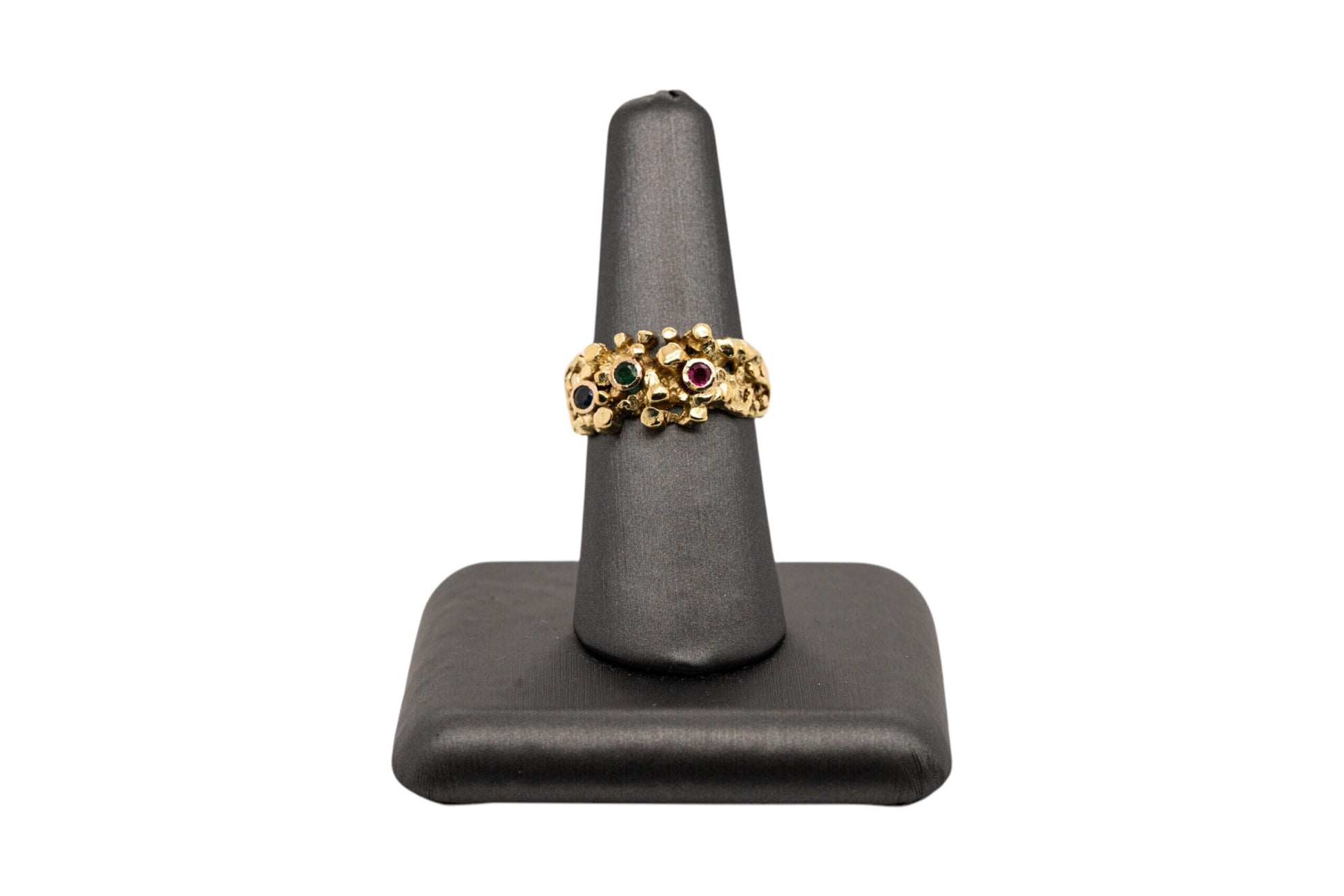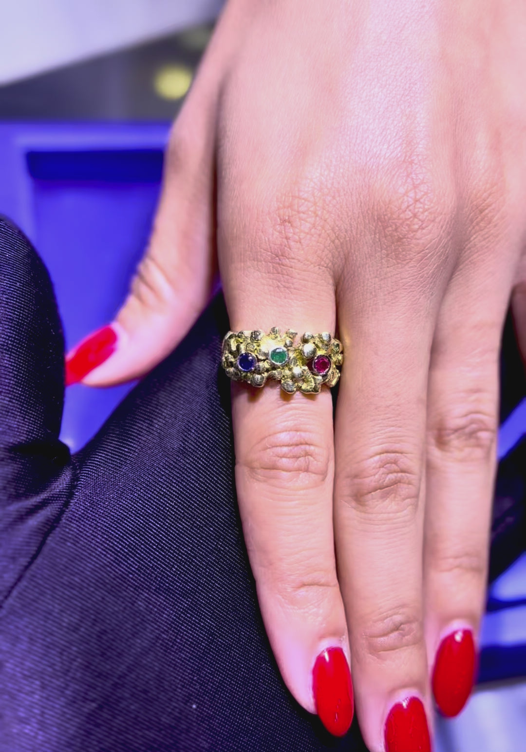 Adorning the textured gold are vibrant emerald and sapphire gemstones, carefully set to enhance the organic flow of the band. The wide 11.1mm band ensures a substantial presence on the hand, while the size 7 fit offers everyday comfort with striking visual impact.