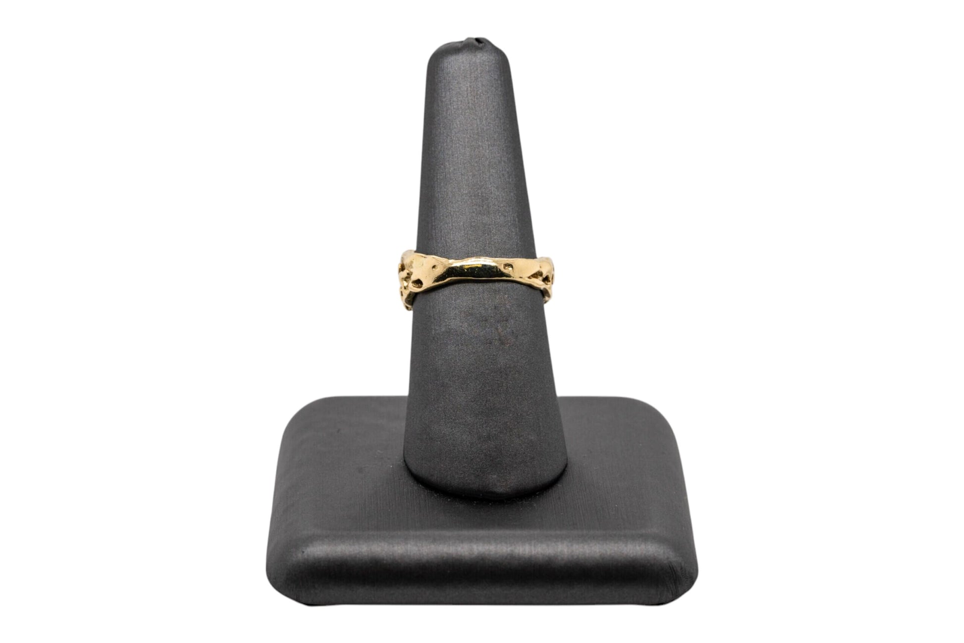 Crafted in rich 14k gold, the ring features a distinctive bark-like finish that adds depth and dimension to its design—perfect for those who appreciate vintage elegance with a bold edge.