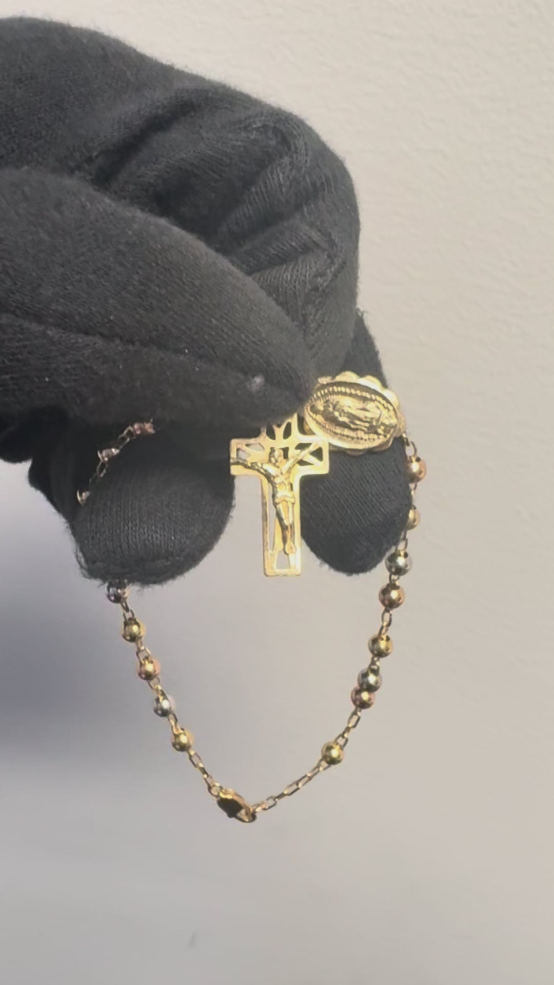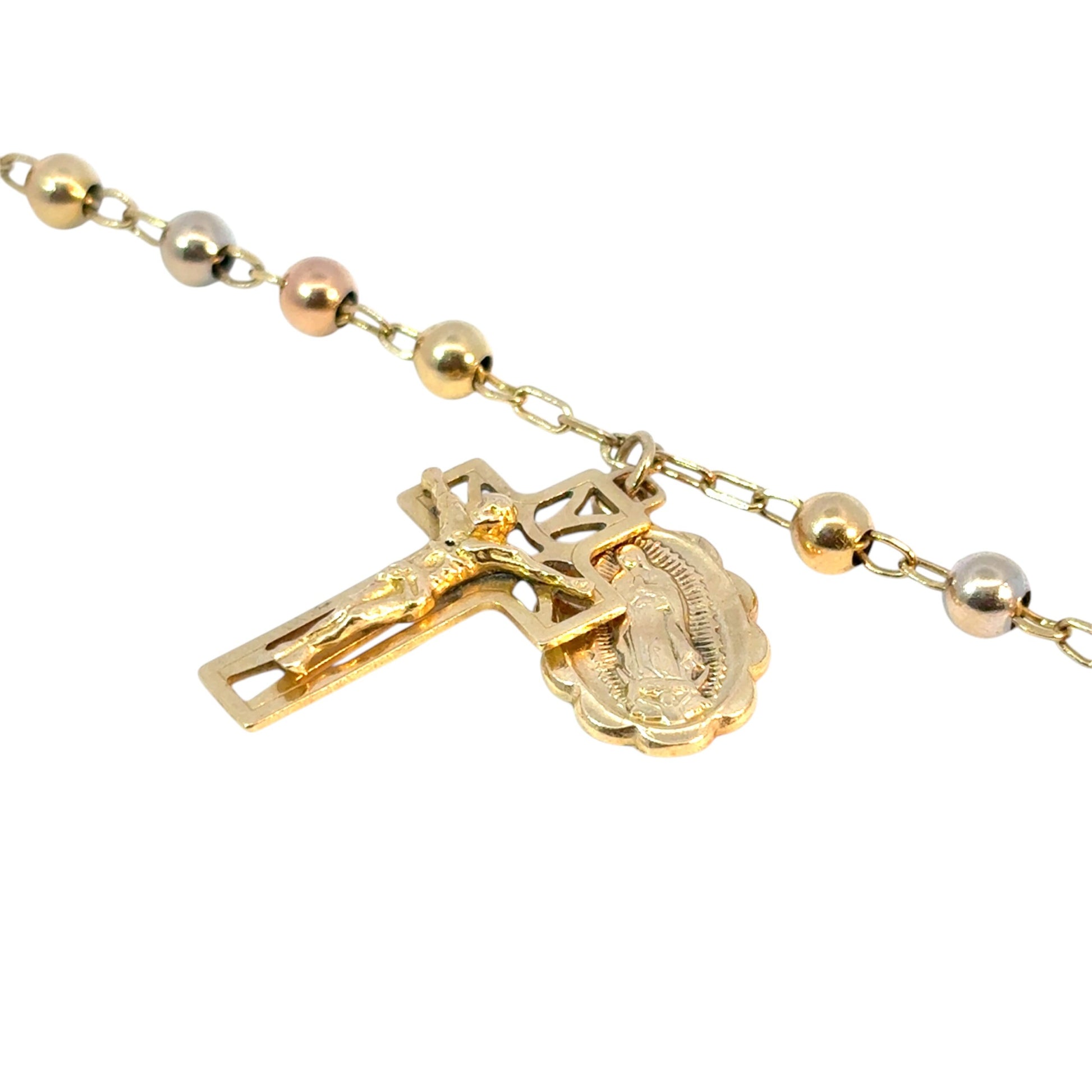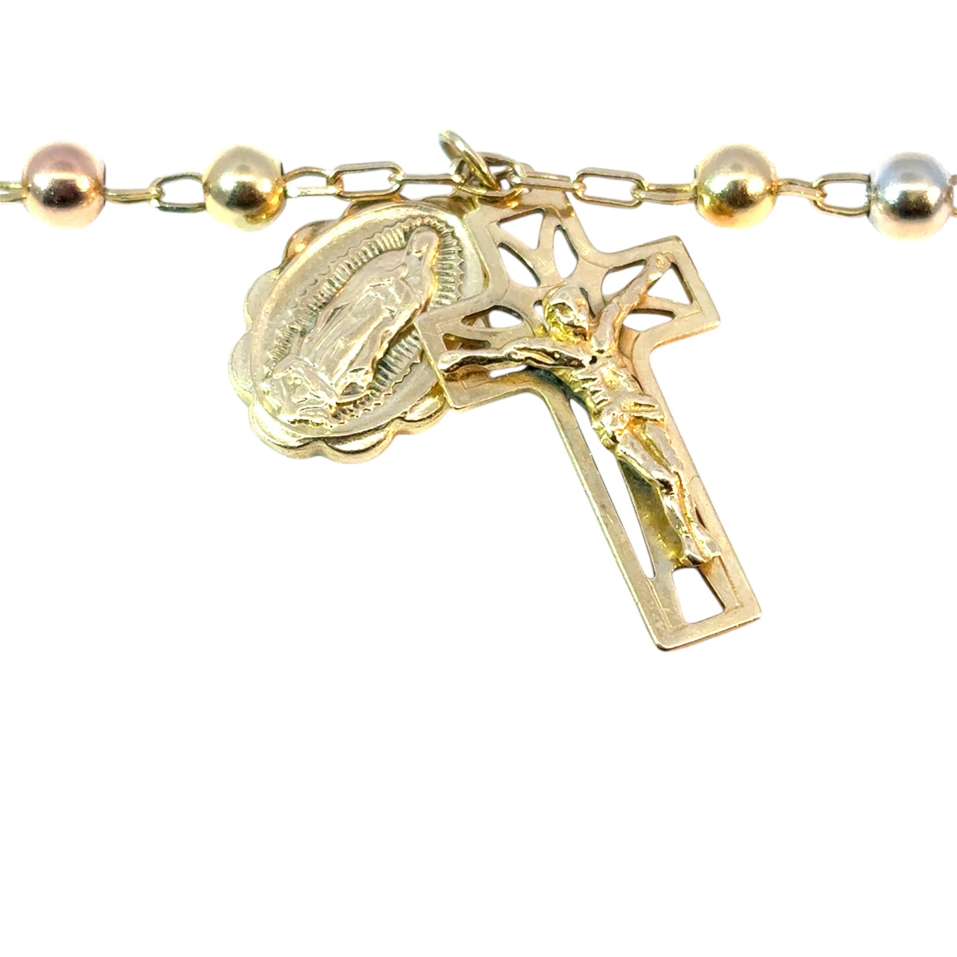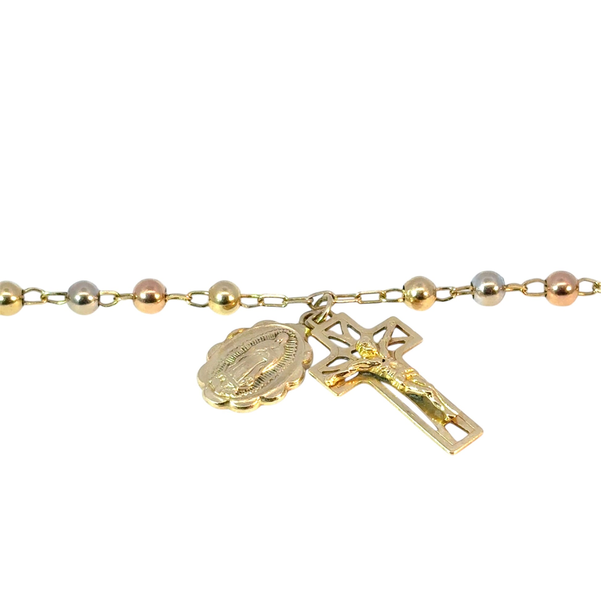 Vintage 14k Yellow Gold Rosary Bead Bracelet with Cross Jesus Pendant and Oval Mother of Mary Pendant