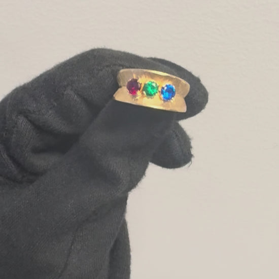 | Gemstone Color | This ring showcases three vibrant gemstones, each in a distinct color: one blue, one green, and one red. |